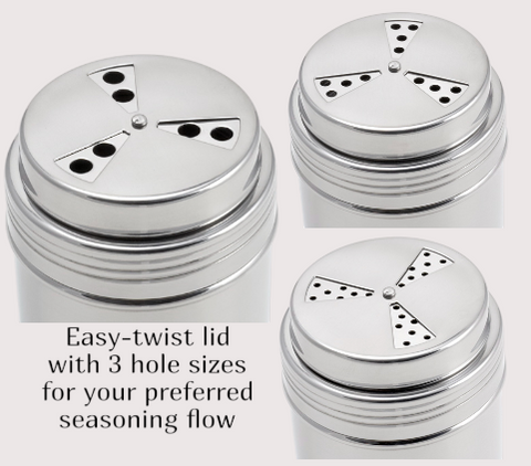 Shake! Shake! Shake! Turn the lid and choose how much you like to shake out from this handsome stainless steel shaker. Both interior and exterior is made of quality stainless steel, so safe and hygienic. Three adjustable size openings on top, so whether you want to add a little seasoning to your food, sprinkle some Parmesan cheese powder on your pasta, or add lots of chili pepper on your pizza, you have the total control. It can also shut completely and block out any dust when not in use. Contemporary brushed stainless steel body. Easily twist to open lid for quick refill. Everybody loves stainless steel so this is a great holiday stocking gift! Each shaker is shipped in a handy non-woven draw-string pouch-your assurance of an authentic StainlessLUX product. Get a few to and you have an awesome spice rack! (**Note: pictures shown brilliant finish. This model is brushed finish)